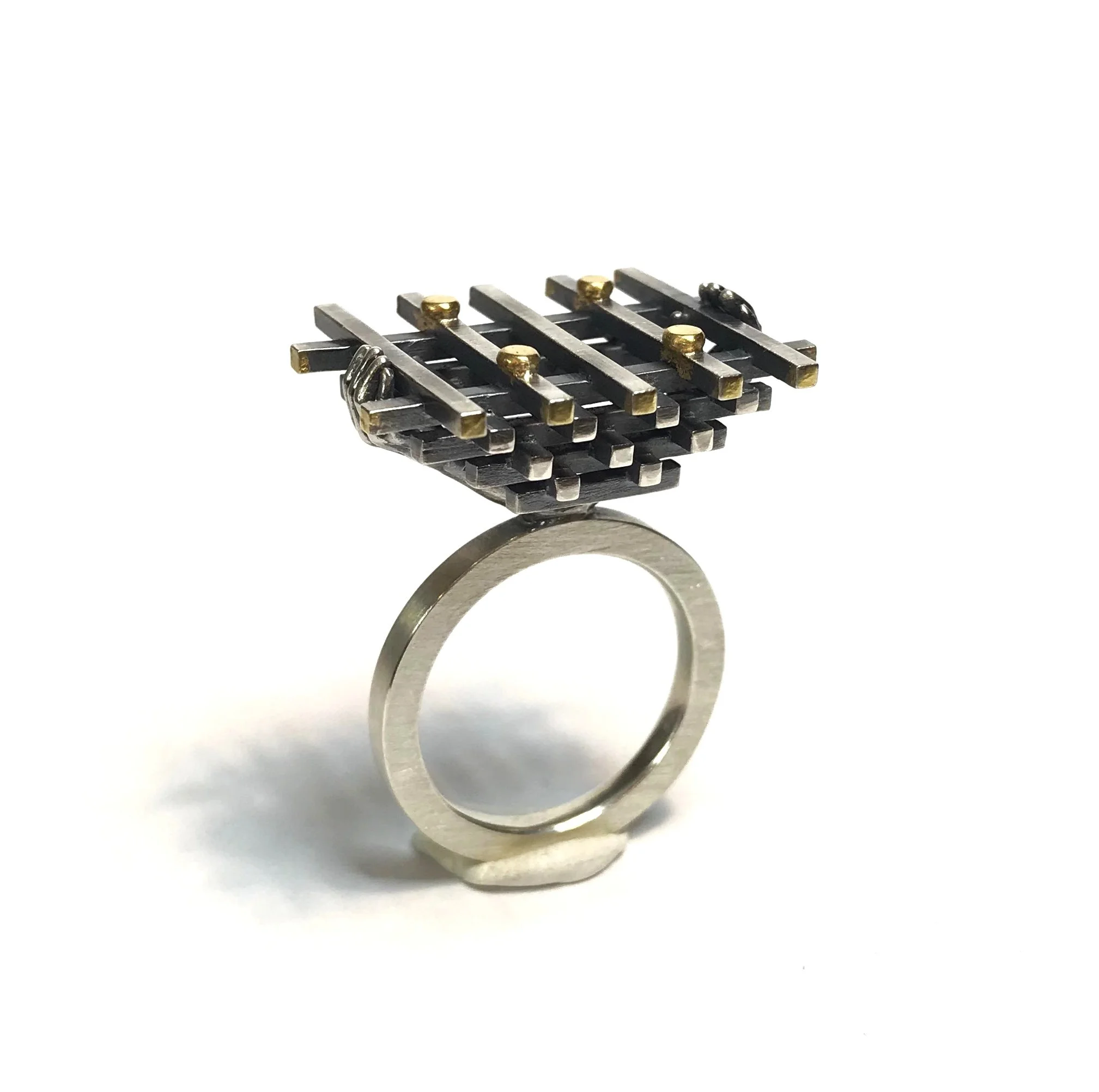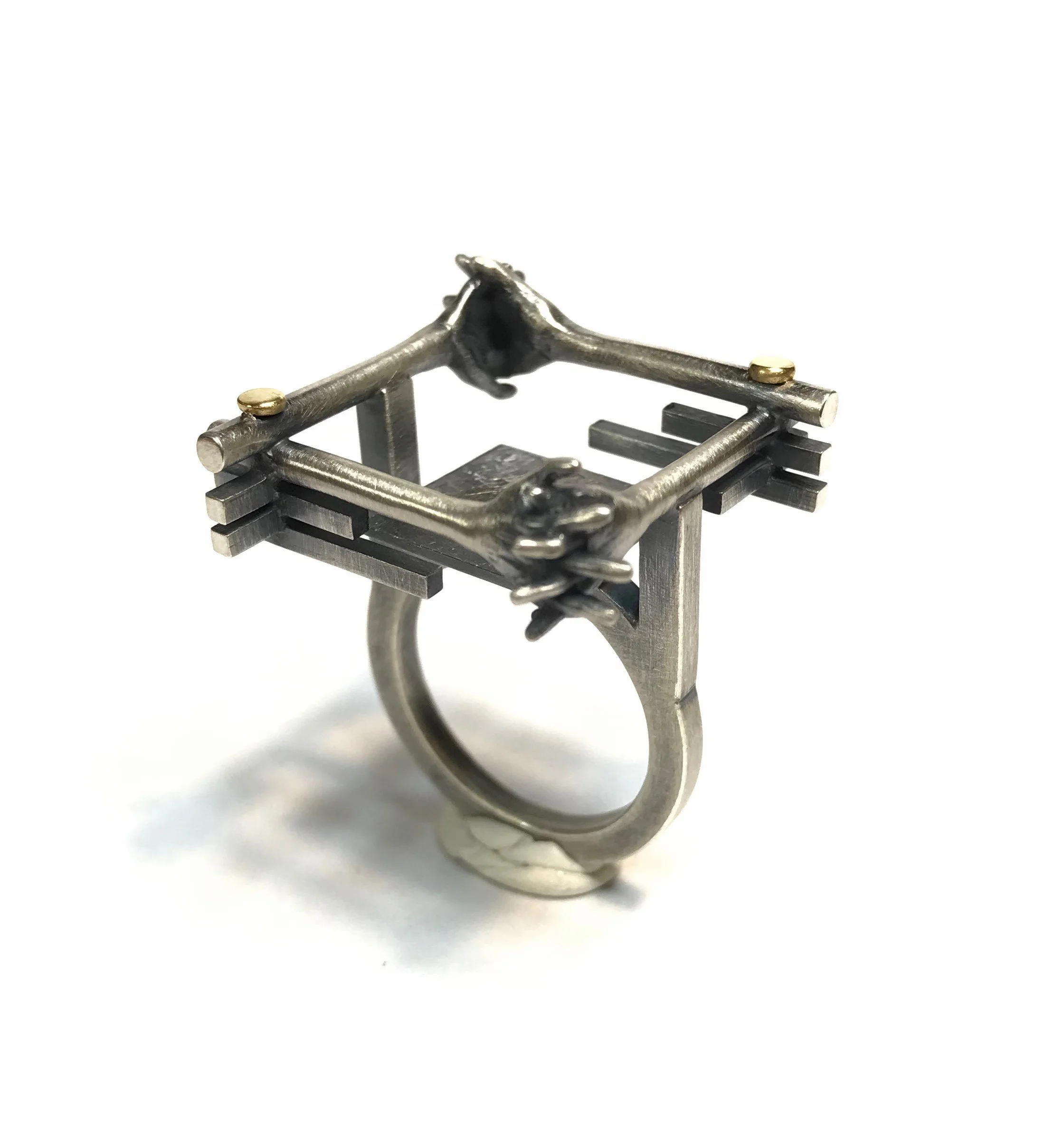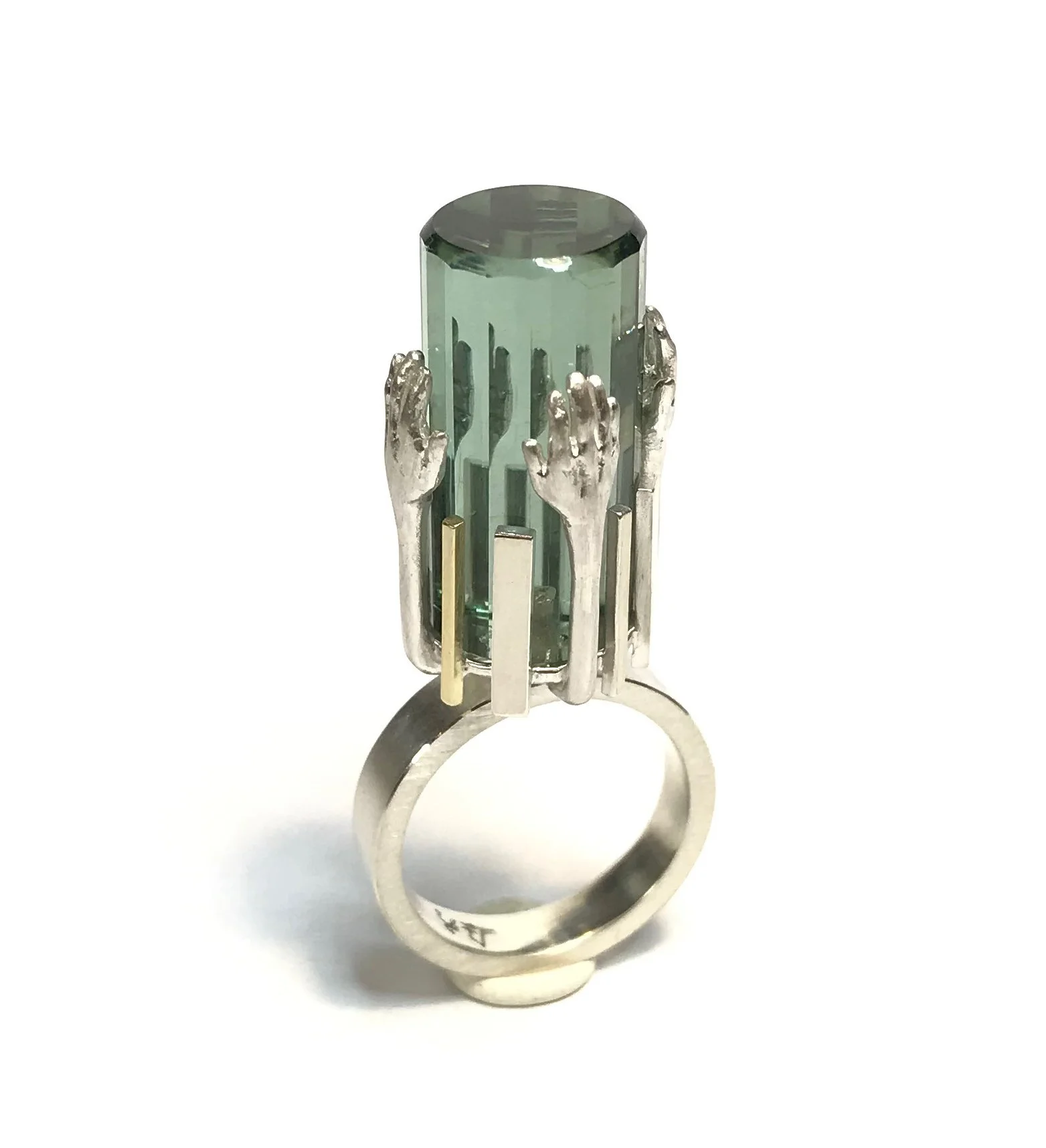 Those rings were made for the exhibition, “Jewelry from Architecture.” They were inspired by the architectures of Kengo Kuma, as well as Japanese joineries. Rings, 2020Sterling Silver, 22k Gold, 18k Gold, Green Amethyst Go Back